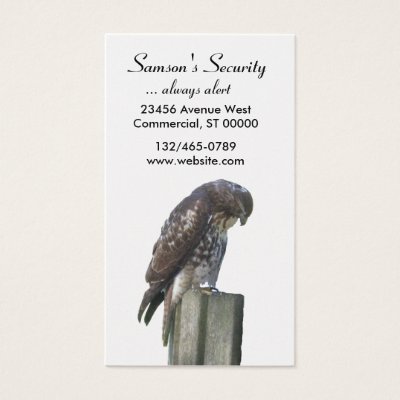 Strong message of security is conveyed by falcon perched on a post and keeping watch below. Personalize with your business name, tag line, address, contact numbers.