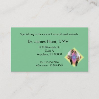Personalize this card for anyone working with cats. At top is a tag line for "specialization" Central text is Name, Address, with phone numbers at the bottom. In lower right corner is the image of a c...